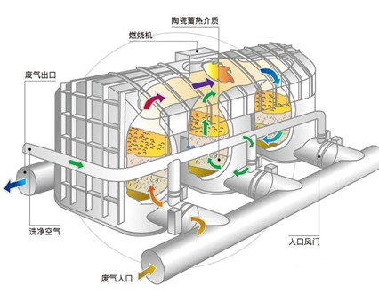 RTO主体结构由燃烧室、陶瓷填料床和切换阀等组成。该装置中的蓄热式陶瓷填充床换热器可使热能得到回收,热回收率大于95%,处理VOC时不用或使用很少的燃料。